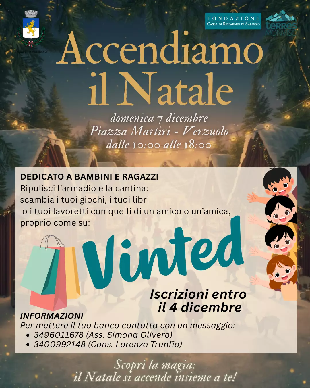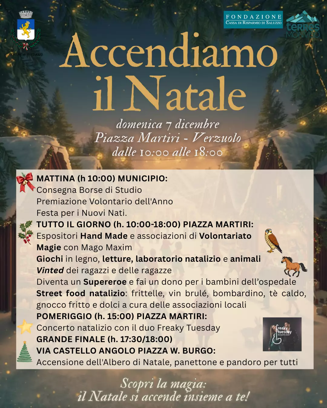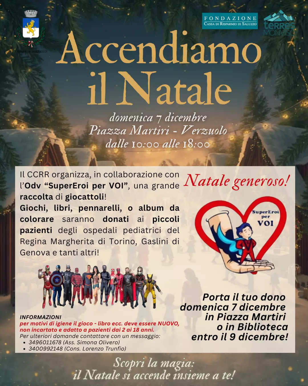 Il profumo di vin brulé e frittelle, il suono delle risate e lo scintillio delle luci: Verzuolo si prepara a vivere l'evento "Accendiamo il Natale", in programma domenica 7 dicembre in Piazza Martiri, dalle ore 10:00 alle 18:00. Sarà una giornata in cui la comunità si stringe per celebrare, divertirsi e, soprattutto, donare. Un Cuore Grande che Batte per la Solidarietà. Il vero protagonista di questa giornata sarà lo spirito di altruismo. In collaborazione con l'Odv "SuperEroi per Voi", il CCRR ha organizzato una grande raccolta per portare gioia a chi ne ha più bisogno. L'appello è a tutti i cittadini: portate giochi, libri, pennarelli o album da colorare nuovi, e diventate un "SuperEroe per Voi". Questi doni verranno infatti consegnati ai piccoli pazienti pediatrici in ospedali come il Regina Margherita di Torino e il Gaslini di Genova. È un gesto semplice, ma potente, per accendere un sorriso. I regali potranno essere lasciati domenica 7 dicembre in Piazza Martiri o in Biblioteca fino al 9 dicembre. Si ricorda che per motivi igienici, si accettano solo oggetti nuovi e non incartati, adatti a bambini e ragazzi dai 2 ai 18 anni. La Piazza sarà in Festa, dalla mattina alla sera La celebrazione prenderà il via già al mattino, con un momento istituzionale in Municipio dedicato alla consegna delle Borse di Studio Vada, alla premiazione del Volontario dell’Anno e alla festa per i Nuovi Nati. Dalle 10:00, Piazza Martiri si trasformerà in un villaggio incantato. Tra gli espositori di Hand Made e le associazioni di Volontariato, i visitatori potranno assistere alle magie del Mago Maxim e curiosare tra i banchi delle Pro Loco di Verzuolo e della Villa e l'associazione I Ciat Ca Rampignu che offriranno un assaggio dei sapori più tipici delle feste: gnocchi fritti, tè caldo, vin brulé, bombardino e dolci. I bambini e le bambine avranno il loro spazio speciale con giochi in legno, letture animate, laboratori natalizi e persino la presenza di cavalli e rapaci. Un'attenzione particolare è rivolta ai giovani con un'iniziativa ispirata a Vinted: una grande occasione per svuotare l'armadio e la cantina e scambiare giocattoli, libri o lavoretti tra amici e amiche. Per allestire il proprio banco, i ragazzi interessati dovranno iscriversi via messaggio entro il 4 dicembre. Come Finale: Musica e Luci in Piazza Il pomeriggio sarà allietato dal Concerto natalizio in Piazza Martiri, dove risuoneranno le note del duo Freaky Tuesday a partire dalle ore 15:00. La festa culminerà nel tra le 17:30 e le 18:00 in Via Castello, all'angolo con Piazza W. Burgo, con il momento più emozionante: l’attesa accensione dell’Albero di Natale. Un gesto simbolico che illuminerà Verzuolo, accompagnato da una dolce conclusione offerta a tutti i presenti con panettone e pandoro. Verzuolo vi aspetta per accendere il Natale... e la solidarietà, insieme a voi!