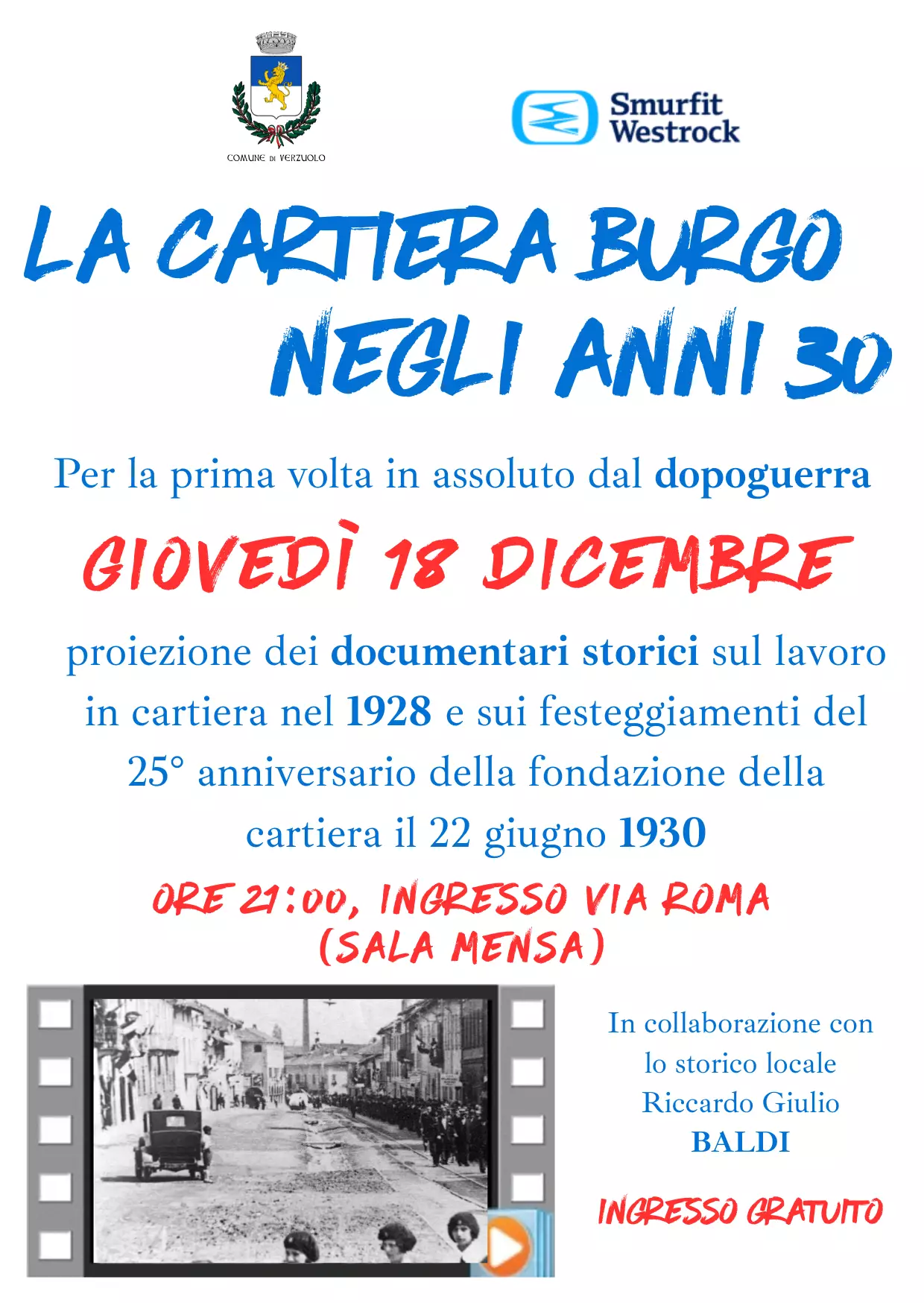 Per la prima volta in assoluto dal dopoguerra, giovedì 18 dicembre, saranno proiettati due documentari storici sul lavoro in cartiera nel 1928 e sui festeggiamenti del 25° anniversario della fondaazione della cartiera il 22 giugno 1930.